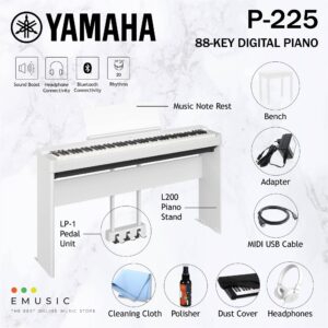 Yamaha P-225 88-key Digital Piano with Piano Stand, Bench, and Headphones – White (P225 / P 225)